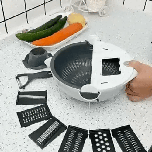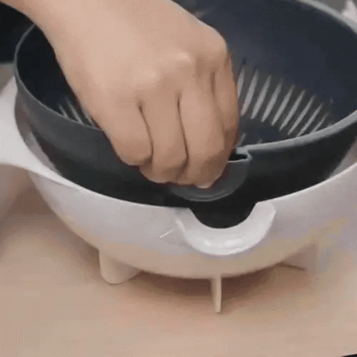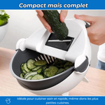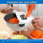 Polyvalence 3-en-1, râpe, coupe et égoutte directement dans le bol.